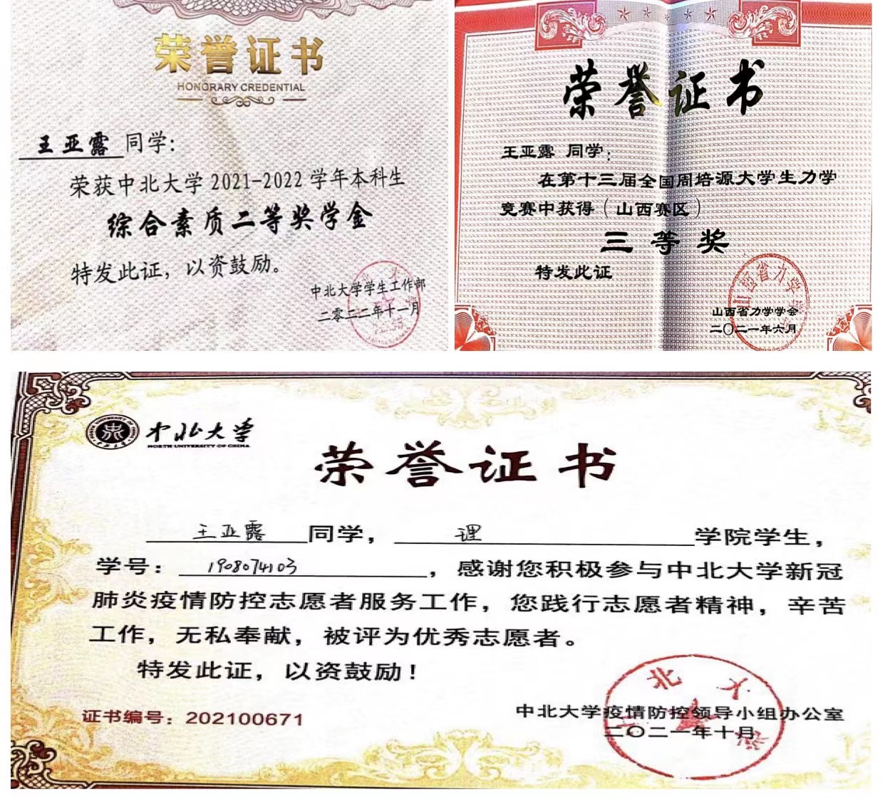 在学科竞赛中,荣获全国大学生数学竞赛省三等奖,全国周培源力学竞赛省三等奖。