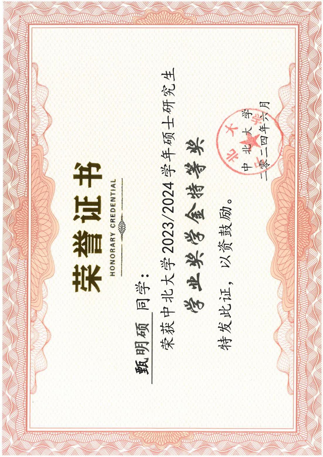 对于学习科研,我始终保持认真严谨的态度,努力学习专业知识,在专业名列前茅并通过英语四六级。获得2023年国家奖学金以及多次学业奖学金,综合素质奖学金。此外,我在研究生期间积极参加学术交流活动,严格遵循科学严谨的求学和研究态度,实事求是,认真钻研,不断提高科研能力,并在导师的指导下发表SCI论文三篇,另外还有一篇在投。