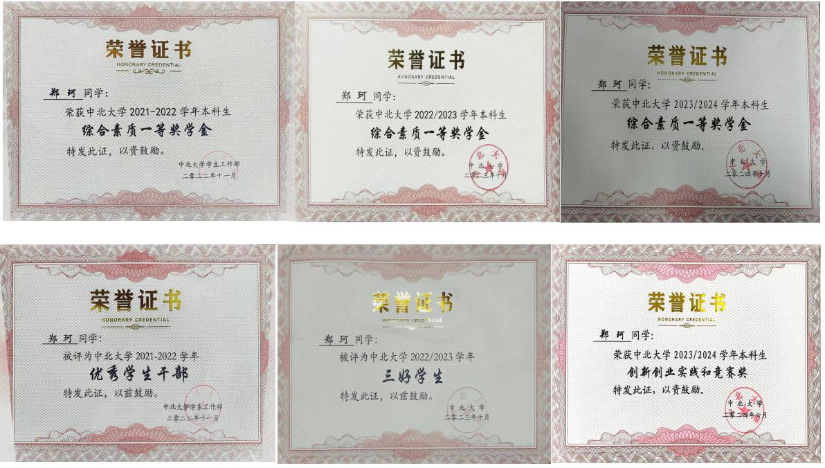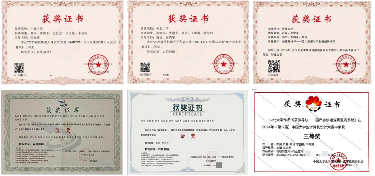 优秀学生干部等荣誉称号。在学科竞赛上,曾获山西省互联网+金奖两次、全国大学生嵌入式芯片与系统设计竞赛全国三等奖、睿抗机器人开发者大赛全国二等奖等,累计获得国家级奖项9项、省部级奖项十余项、校级奖项若干: