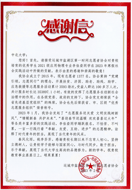 2023年6月2日,体育赛事直播 团委收到了来自运城市盐湖区第一时间青年志愿者协会的感谢信,信中对体育赛事直播 2021级应用物理专业李佳姿同学的优秀志愿事迹进行了高度评价。