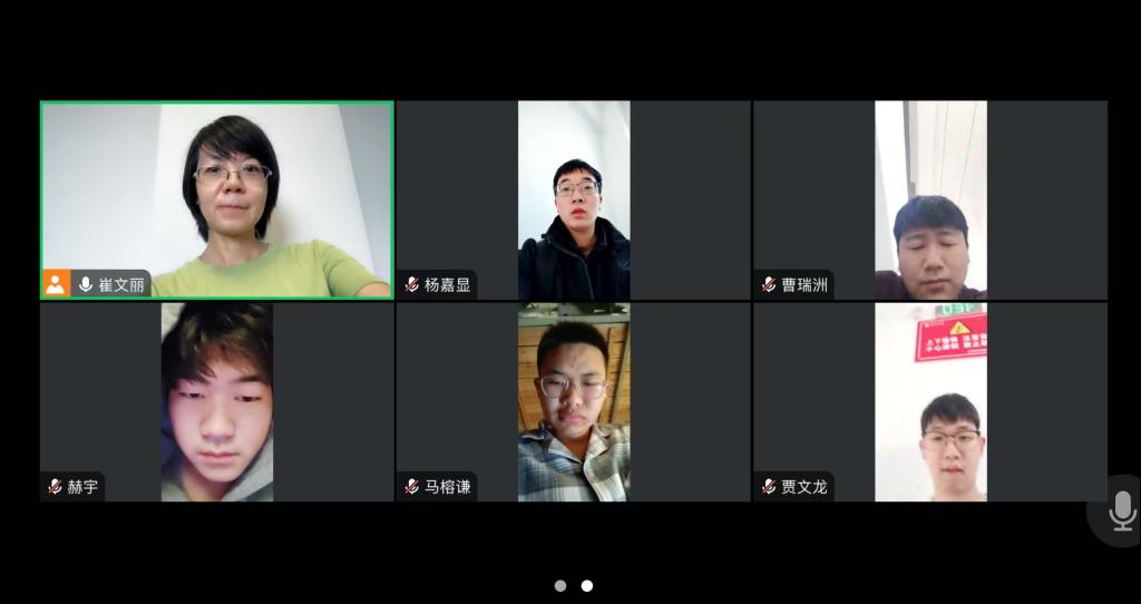本学期学业导师崔文丽老师组织23级帮助成长的5名同学(2319014234赫宇、2319014214杨嘉显、2319014217曹瑞洲、2319014235马榕谦、2319014223贾文龙)召开了线上视频会议,积极了解学生学习与生活的基本情况,并要求他们提交了校园日常生活的成长点滴,具体提交素材如下:
