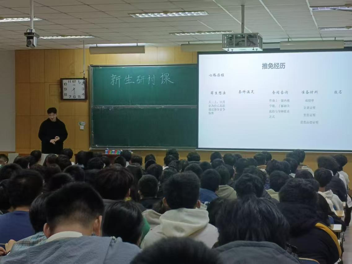 学长这大学四年的经历。分享过程中,同学们对学长的大量成就感到震惊,也暗自下决心要成为学长这样的优秀学生。学长也对新生们表达了自己的鼓励与祝贺。
